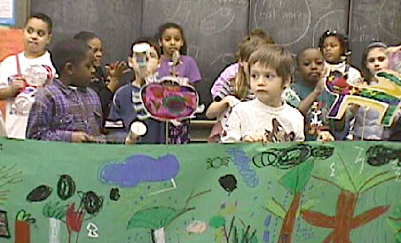 Third grade students performing an original story with narration, dialogue, homemade instruments, puppets, and scenery.
